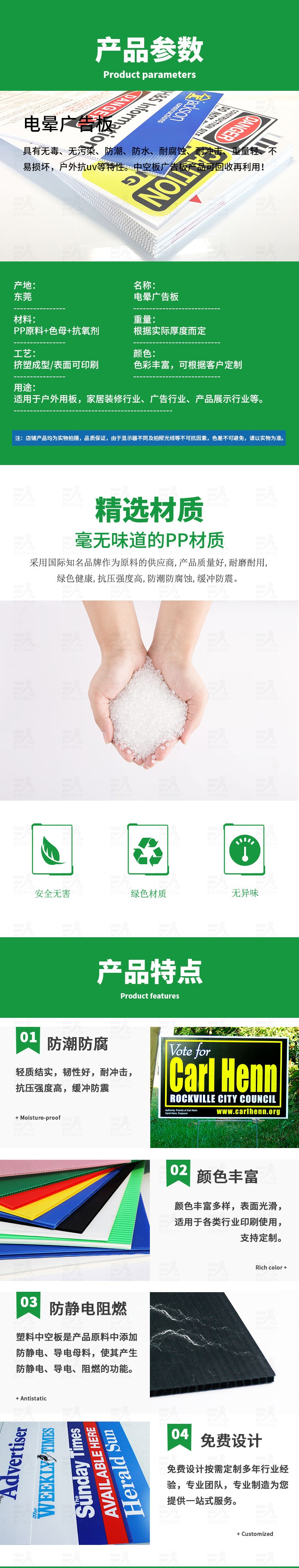產品簡介:抗UV中空板是采用現代化工HDPE和HDPP材料,是一種重量輕(空心結構)、無毒、無污染、防水、防震、抗老化、耐腐蝕、顏色豐富的新型材料,相比于紙板結構產品,中空板具有防潮、抗腐蝕、更輕便等優勢來代替紙板。 板材表面印字、噴畫、貼畫等后加工制作出各類環保產品;